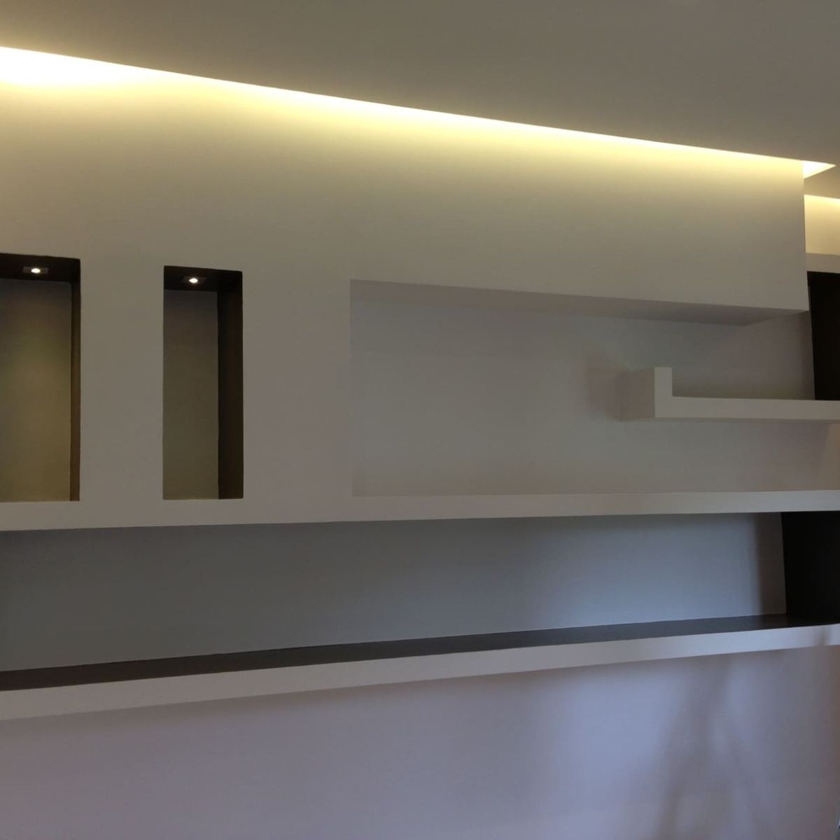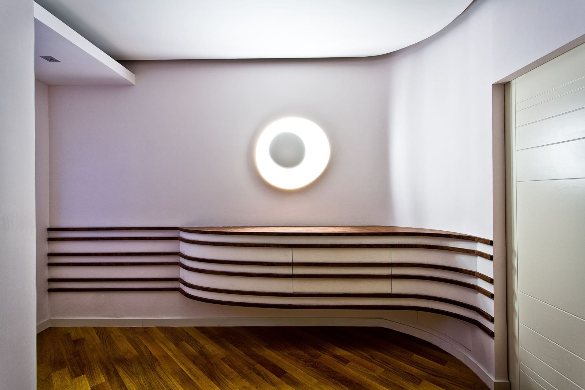 Abbassando i soffitti abbiamo regalato un tocco di originalità all’ambiente, favorendo il sistema di illuminazione: l’inserimento dei vari elementi architettonici stimola la sensazione di entrare in ambienti separati, al cui interno ogni spazio mantiene comunque la propria identità.