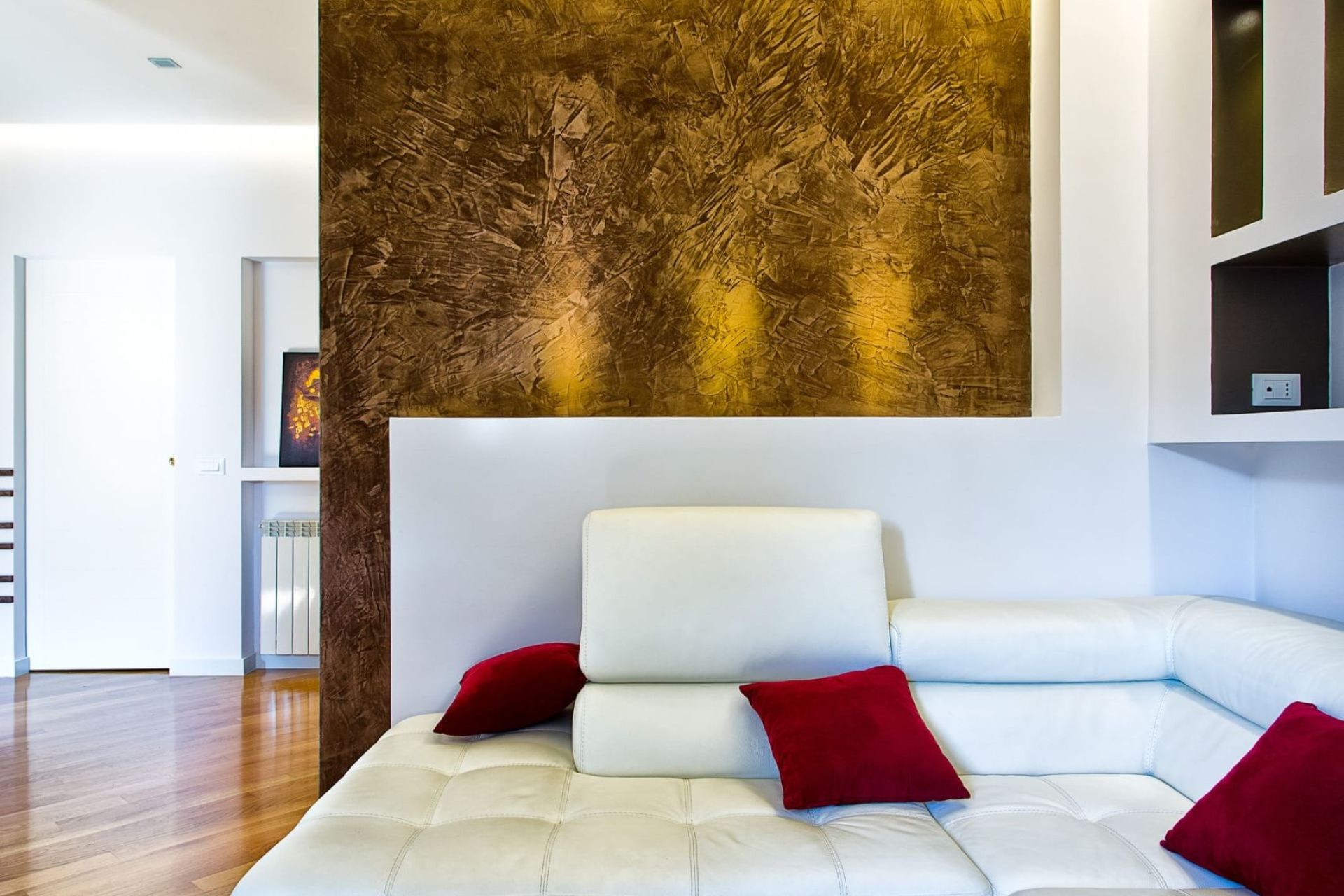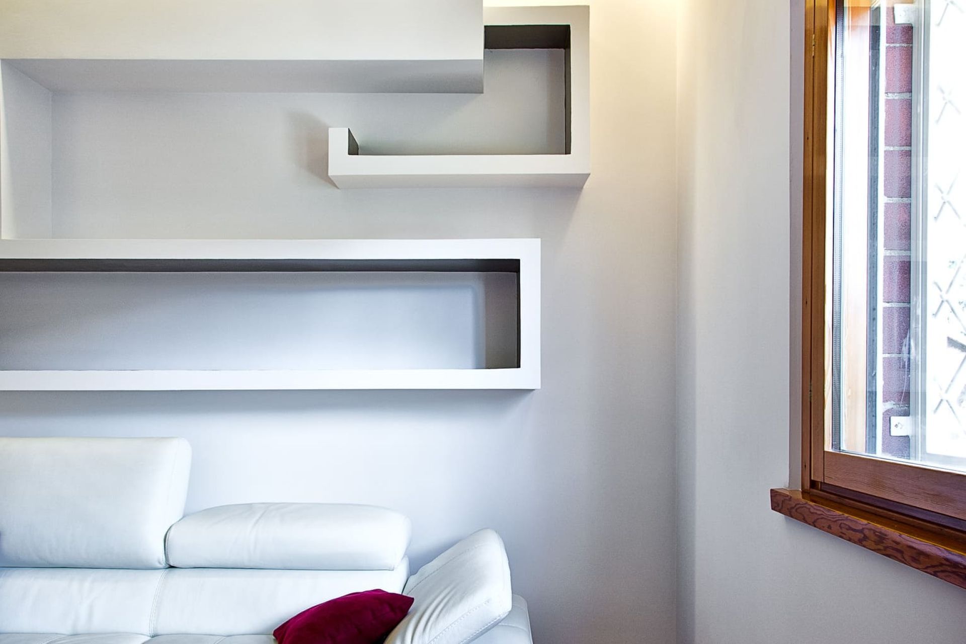 La zona soggiorno, pur essendo a vista, ha conservato la propria intimità, grazie a un particolare divisorio in muratura (cartongesso), con un gioco di aperture che ha alleggerito l’importanza della parete; il mobile progettato su misura nella zona d’ingresso rappresenta un momento di forte personalizzazione: la sua presenza nell’ingresso ne impreziosisce la semplicità e lo rende unico.